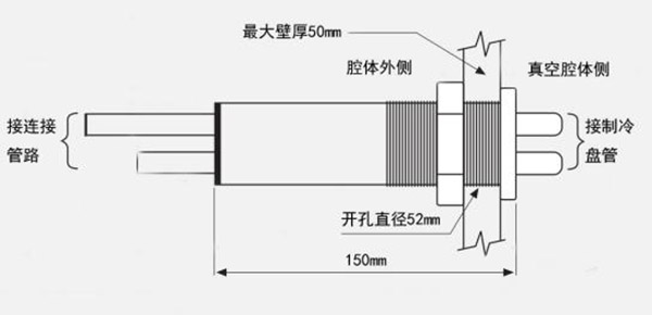 標(biāo)準(zhǔn)輸入裝置,在腔體壁上開一個直徑52mm的孔,采用螺紋連接,O形密封圈密封,用戶也可定制輸入裝置