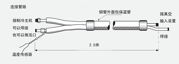 連接管路,連接管路是由兩根銅管和保溫材料組成,兩端均可以焊接也可做成活口,長度可以根據(jù)用戶需求制作,由于管路本身要作為熱負(fù)載來考慮,所以當(dāng)管路長度超過4m時,則應(yīng)選擇大一些的產(chǎn)品。