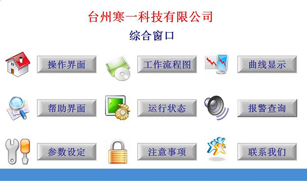 溫度顯示:制冷溫度、待機(jī)溫度、冷卻水水溫等多路溫度顯示,運(yùn)行狀態(tài)欄有待機(jī)運(yùn)行、制冷運(yùn)行、除霜運(yùn)行等狀態(tài)顯示,故障報(bào)警欄有水溫高報(bào)警、水溫高停機(jī)、電源缺相、壓縮機(jī)過載、排氣溫度過高等保護(hù)措施