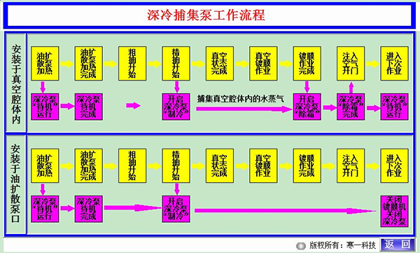 工作流程圖:改圖詳細(xì)介紹了深冷捕集泵跟真空鍍膜機(jī)配合使用時,深冷泵開關(guān)機(jī)時間,開啟制冷的時間和開啟除霜的時間,以便發(fā)揮捕集泵最佳性能。
